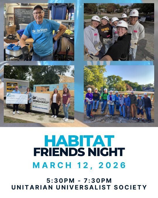When: Thursday, March 12th 5:30pm-7:30pm Where: Unitarian Universalist Society 2355 Oakdale Road, Coralville Who: ALL HABITAT SUPPORTERS! This is a FREE event that includes a meal. |